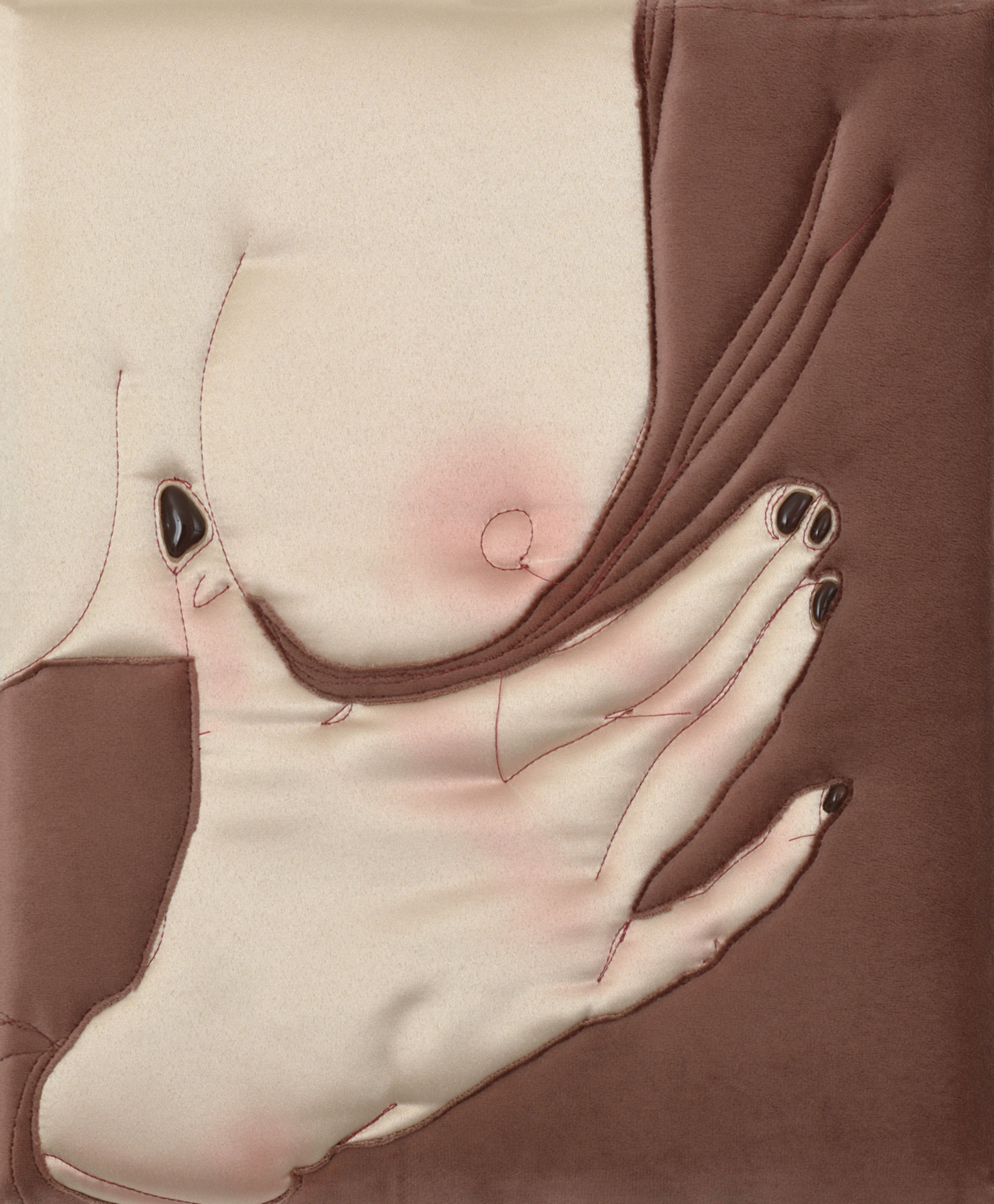 ručně prošívaný satén, samet, akryl a gelové nehty