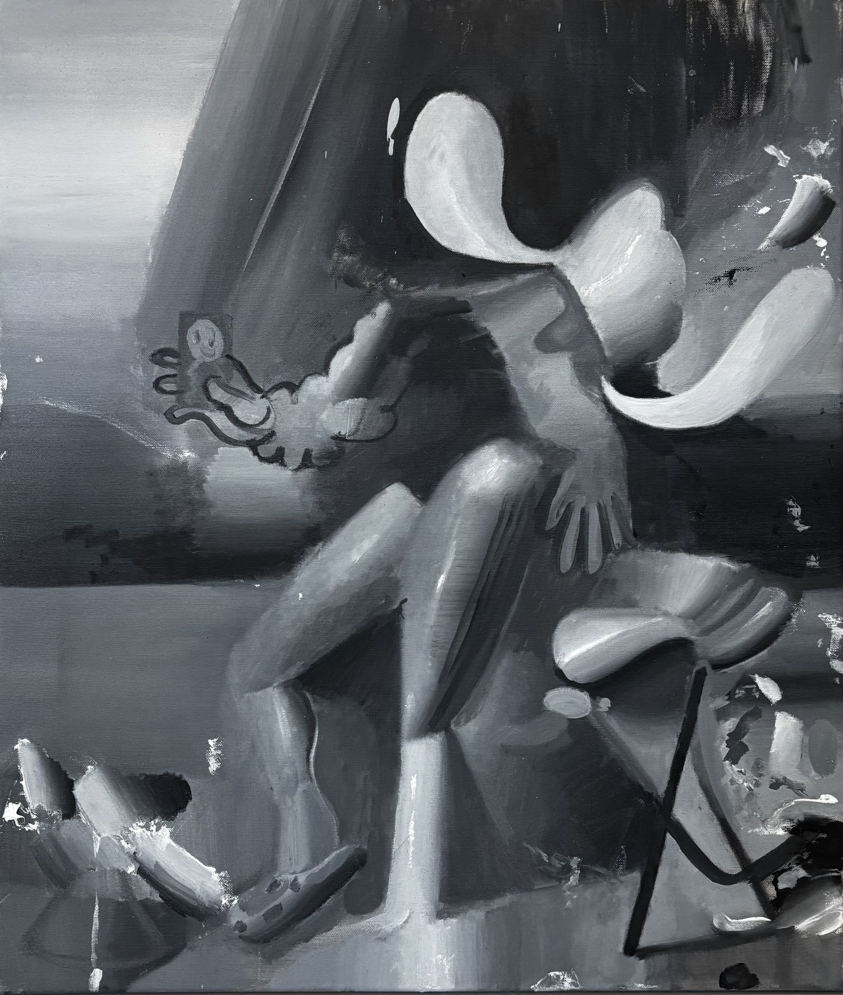 A graduate of the Academy of Fine Arts in Prague (2004–2010, drawing, prof. Jitka Svobodová), Jakub Hubálek creates paintings made on the basis his foundation in drawing, a tendency that is reflected in a fundamental tension between an inclination towards black-and-white (or monochrome) painting and towards distinctive narratives that often abandon the external level of painted illusion in order to model and transform the painting’s very visual vocabulary. This, in fact, is the reason for the frequent presence of new shapes in his work, which reflect subconscious situations requiring the combination of memory, recollections, and their reassessment from a contemporary viewpoint. Hubálek’s paintings often recall old family photographs characterized by an anonymous, impersonal, or vexing memory. Hubálek often works with open-ended gestures and intimations. He gives the form room for possible future movement. He himself exists on the boundary between figuration and abstract art. In 2020, Trafo Gallery published a book on the occasion of his eponymous exhibition Black and White Summer.