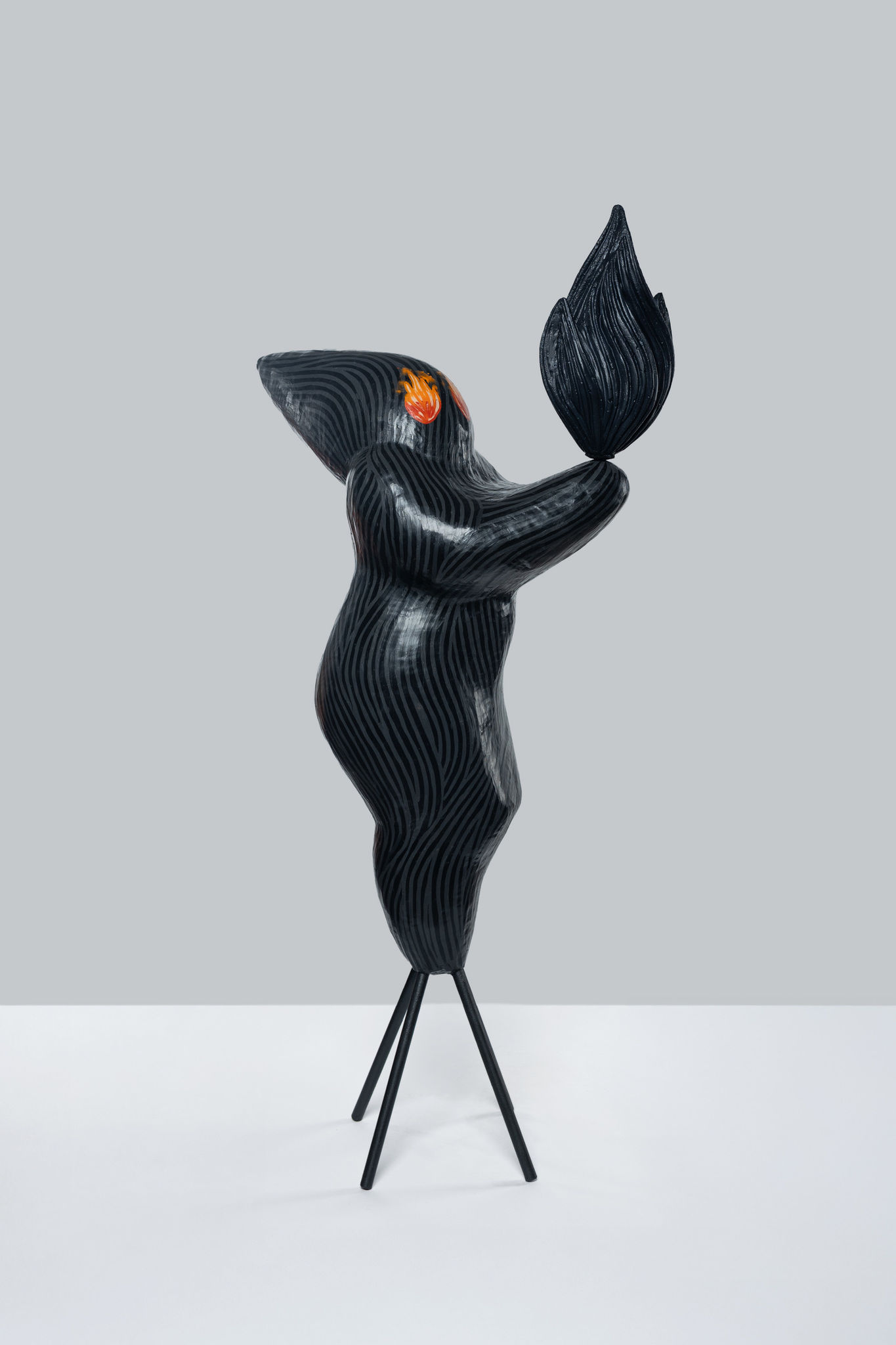 Dana Bartoníčková’s preoccupation with female identity is not only reflected in the content of her sculptures but in her choice of soft material – wax. The artist sees the main quality of wax in its calefaction, a feeling of warmth that does not disappear even from the finished sculptures and paintings. She closely links the theme of femininity with her relationship to clothing, which has defined us for centuries. Fabric on the one hand as something intimate, something with which our skin is connected every day, yet on the other primitively woven fabric as a kind of return to roots, protection, home, security. From the fibres of the fabric Bartoníčková also derived the principle of hatching and lines that she uses to create a particular pattern on the sculptures suggesting the features of the body and face. Her favourite subject is hair, a time-honoured symbol of female beauty. The washing of hair also touches on the theme of the elements contained in Bartoníčková’s work in the form of fires, stones and water. The close connection with natural motifs has resulted in the image of the starry sky within the characters themselves, where, in connection with the universe, the artist seeks peace and satisfied her compulsive need to be at one.