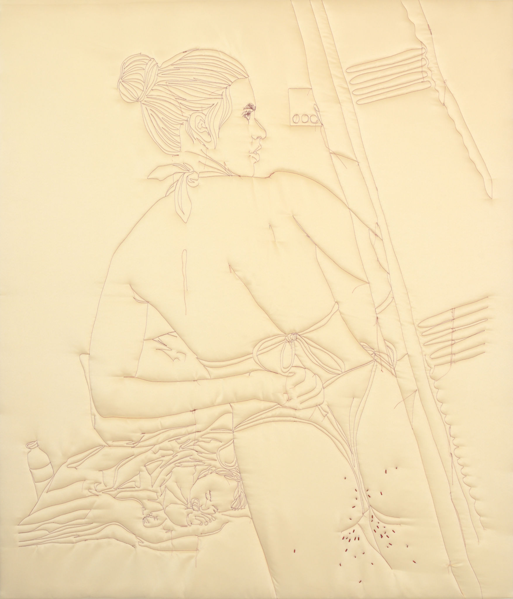 Lucie Rosická's work explores the intersection between traditional and contemporary techniques. Her works are a mixture of the hand-making that her grandmother taught her, classical painting and her newfound passion for fabrics and materials. The result is a unique style of figurative art that evokes personal memories and emotions. She completed a work placement in Turin, Italy, where she discovered the rich history of materials and fashion. This experience stimulated her interest in elevating textile techniques to fine art. In addition, she participated in a residency in New York where she found the freedom to experiment and develop her own artistic vision. To create her characters, she uses various fabrics, from high-end materials to found fabrics from second-hand shops. Through this medium, she is able to capture the essence of a place or moment in time and convey her personal experiences. She believes that the tactile nature of fabrics allows for a more intimate connection with the viewer, as everyone has a personal relationship with textiles.